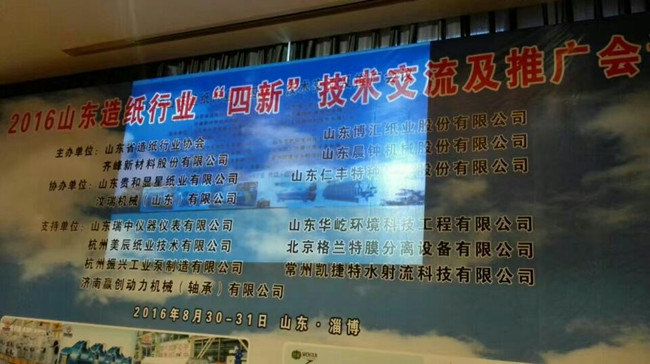 2016年8月30—31日,由山東省造紙行業(yè)協(xié)會、山東博匯紙業(yè)股份有限公司、齊峰新材料股份有限公司、山東晨鐘機械股份有限公司主辦,山東貴和顯星紙業(yè)有限公司、山東仁豐特種材料股份有限公司、汶瑞機械(山東)有限公司等單位協(xié)辦的“2016山東造紙行業(yè)‘四新’技術(shù)交流及推廣會議”在山東省淄博市召開。會議由山東省造紙行業(yè)協(xié)會秘書長趙振東先生主持,淄博市輕紡行業(yè)協(xié)會副會長劉鋒章先生致辭并講話,山東博匯集團有限公司董事長楊延良先生致辭。
