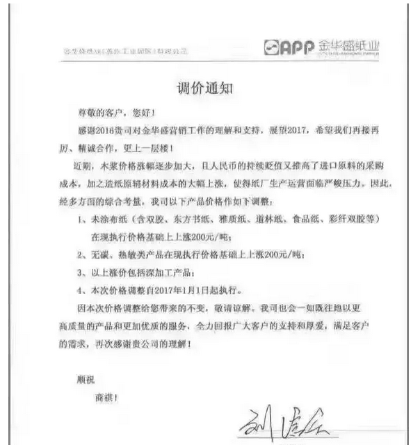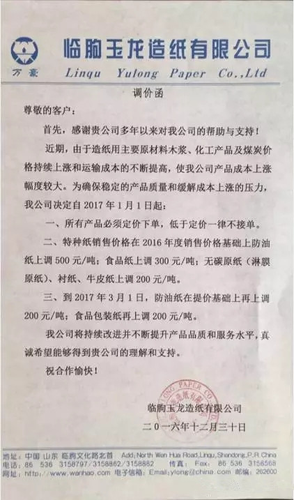 1.2017年1月1日起,山東臨朐玉龍?jiān)旒堄邢薰拘?,特種紙銷售價(jià)格在2016年度銷售價(jià)格基礎(chǔ)上防油紙上調(diào)500元/噸;食品紙上調(diào)300,無(wú)碳原紙(淋膜原紙)、襯紙、牛皮紙上調(diào)200元/噸。至2017年3月1日,防油紙?jiān)谔醿r(jià)基礎(chǔ)上再上調(diào)200元/噸;食品包裝紙?jiān)偕险{(diào)200元/噸。