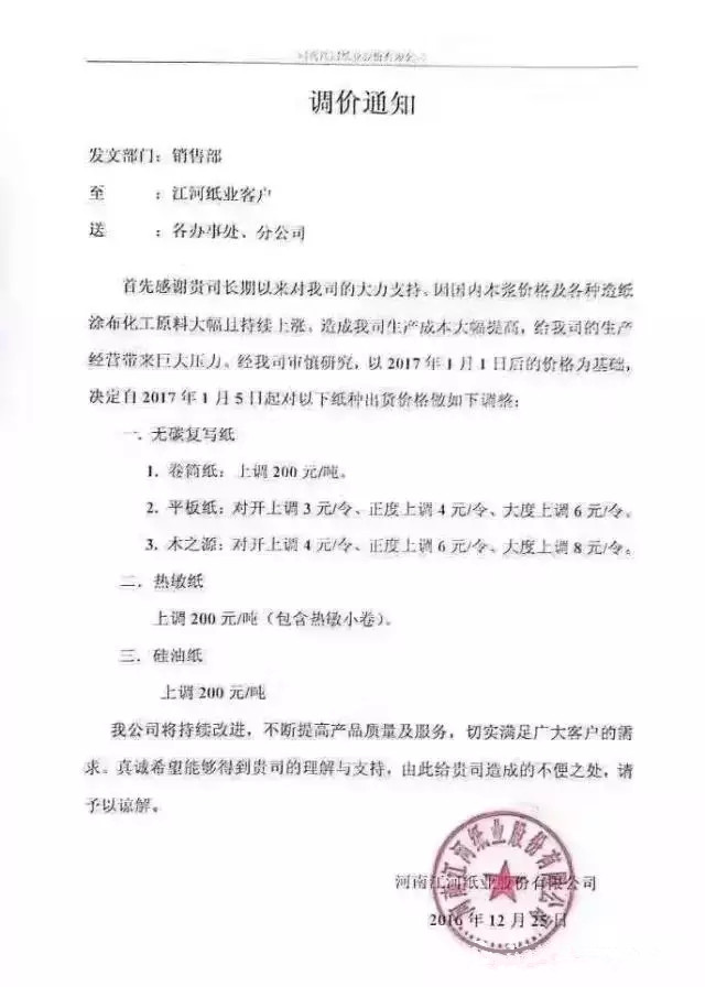 3.2017年1月5日,江河紙業(yè)上調(diào)無(wú)碳復(fù)寫(xiě)紙、熱敏紙、硅油紙價(jià)格200元/噸。