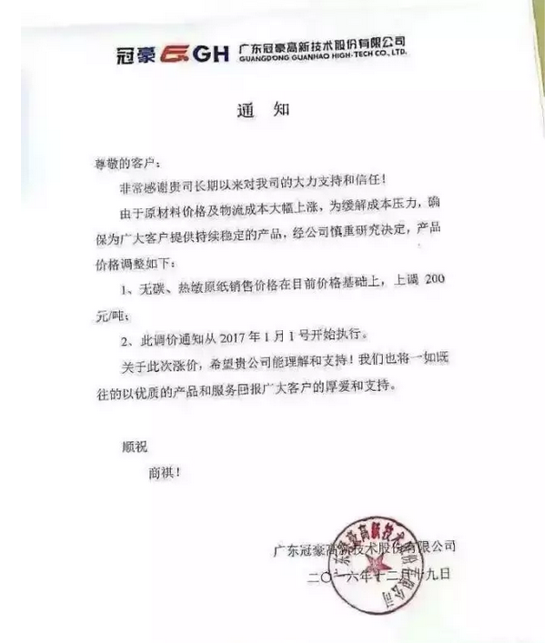 4.2017年1月1日,冠豪上調(diào)無(wú)碳、熱敏原紙價(jià)格200元/噸。