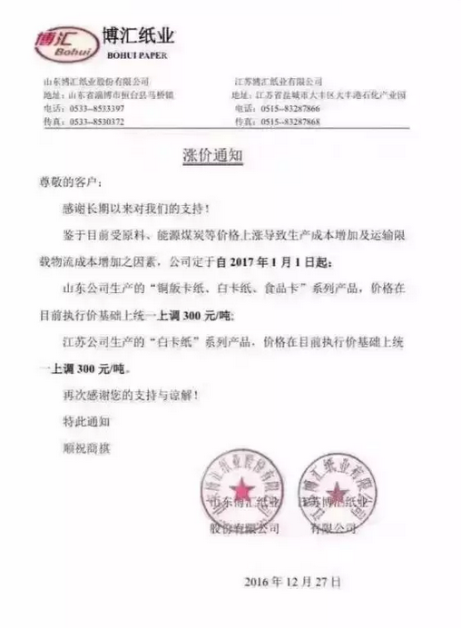 5.2017年1月1日,博匯上調(diào)食品卡紙價(jià)格300元/噸。