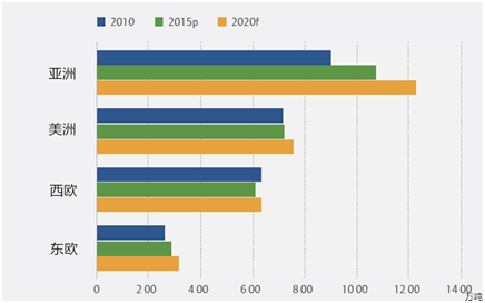 圖1 世界不同地區(qū)特種紙生產(chǎn)量分布及預(yù)測