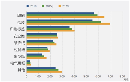 Smithers Pira市場報(bào)告對全球特種紙生產(chǎn)量區(qū)域分布及預(yù)測見圖1。從圖1可以看出,2015年亞洲特種紙生產(chǎn)量超過1000萬噸,約占全球特種紙生產(chǎn)量的40%。預(yù)計(jì)到2020年,美洲和歐洲特種紙生產(chǎn)量將有小幅度增長,全球的增量將主要集中在亞洲。報(bào)告中對不同紙種的分析如圖2所示,其中,印刷、包裝和標(biāo)簽類特種紙生產(chǎn)量所占比例較大,同時(shí)也是未來5年市場潛力較大的紙種。
