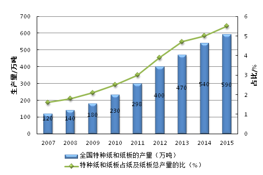 圖3 2007—2015年我國特種紙及紙板生產(chǎn)量變化情況