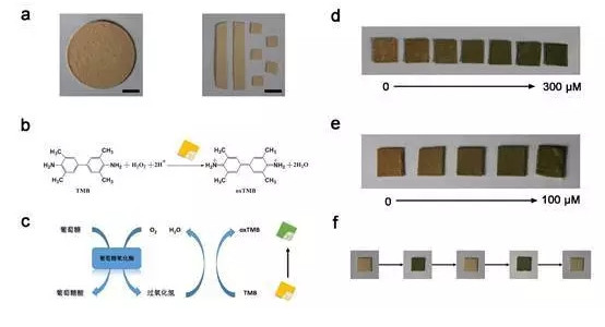 圖1. (a) 不同尺寸和形狀的快速檢測試紙,標(biāo)尺為1 cm;(b) 檢測過氧化氫的基本原理;(c) 檢測葡萄糖的基本原理;(d) 對不同濃度的過氧化氫進(jìn)行分析檢測;(e) 對不同濃度的葡萄糖進(jìn)行分析檢測;(f) 檢測試紙可實(shí)現(xiàn)多次回收再利用。