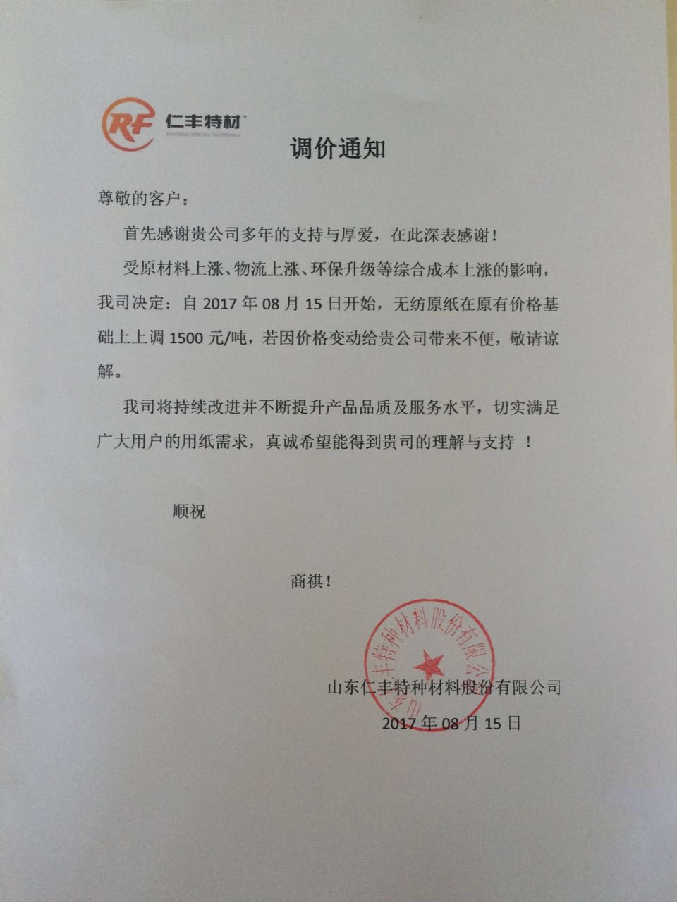 1、 自8月15日起,仁豐特材無紡原紙在原有價格基礎上上調1500元/噸。