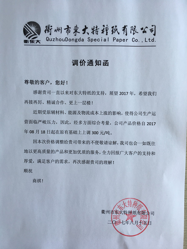 2、 自8月18日起,衢州東大特種紙產品在原有基礎上上調300元。