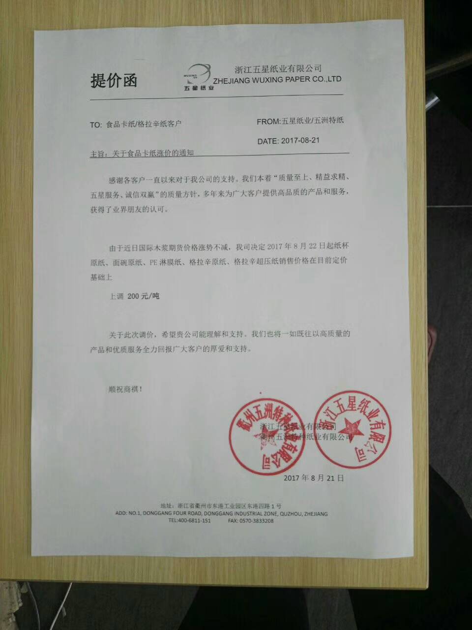 3、 自8月22日起,五洲、五星食品卡紙、格拉辛紙每噸上調200元。