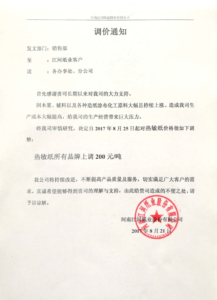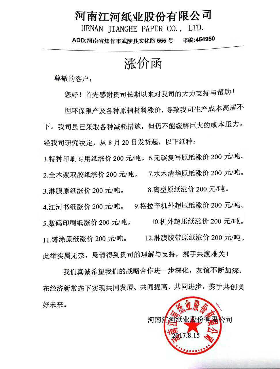 4、 自8月25日起,江河紙業(yè)生產的熱敏紙所有品牌上調200元/噸。進入8月份,江河紙業(yè)特種印刷專用紙、全木漿雙膠紙、淋膜原紙、江河書紙、數碼印刷紙、無碳復寫原紙、格拉辛紙等12個紙種調價2次,每次每噸漲200元。