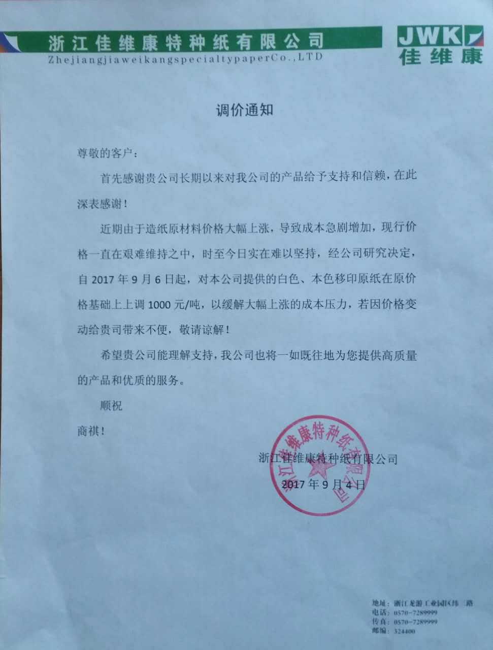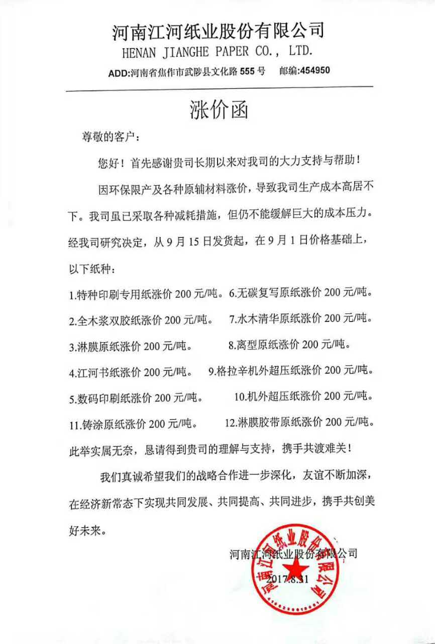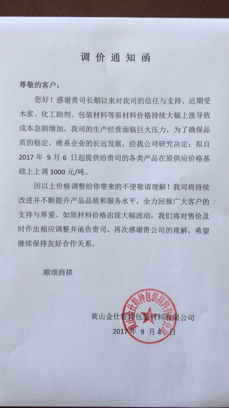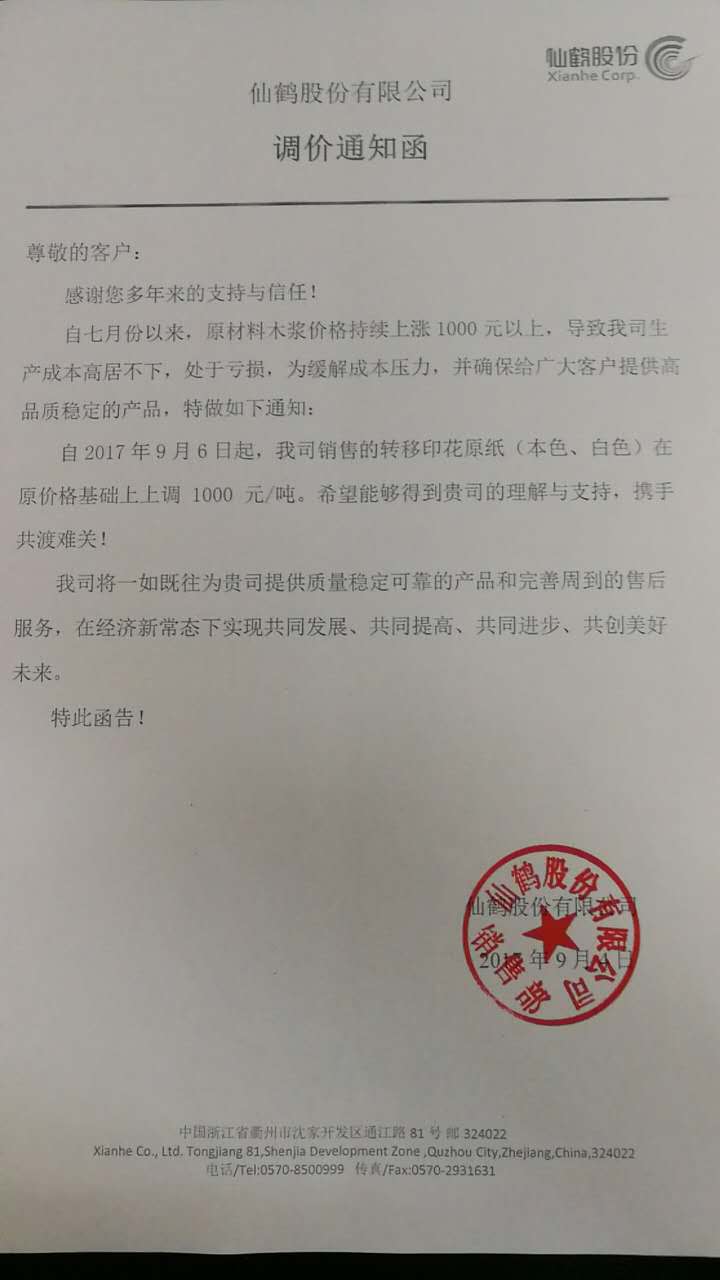 5、 自9月1日起,仙鶴股份公司所有產品根據實際生產成本,價格上調500-1000元/噸。自9月6日起轉移印花紙在原價格基礎上上調1000元/噸。