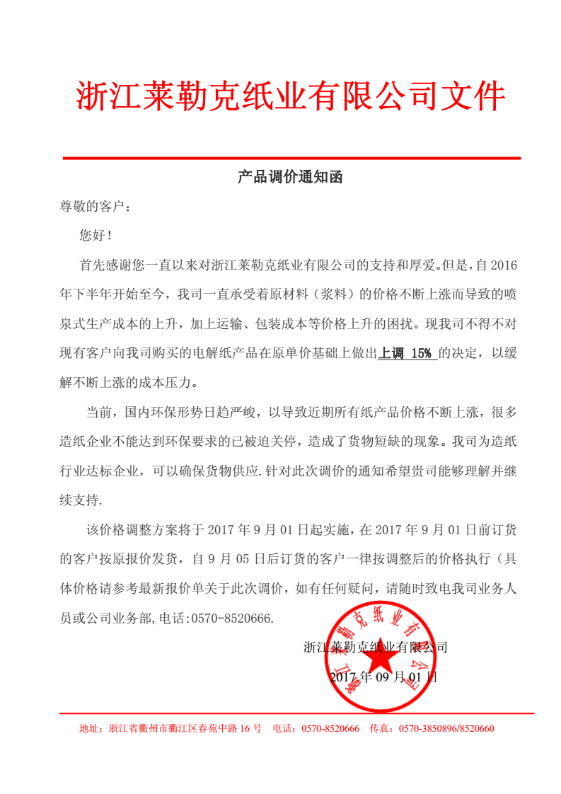 6、 自9月1日起,浙江萊勒克紙業(yè)電解紙在原價格基礎上上調15%。