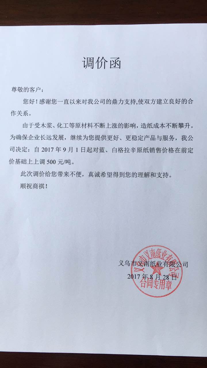 7、 自9月1日起,義烏義南紙業(yè)藍、白格拉辛紙在原銷售價格基礎上上調500元/噸。