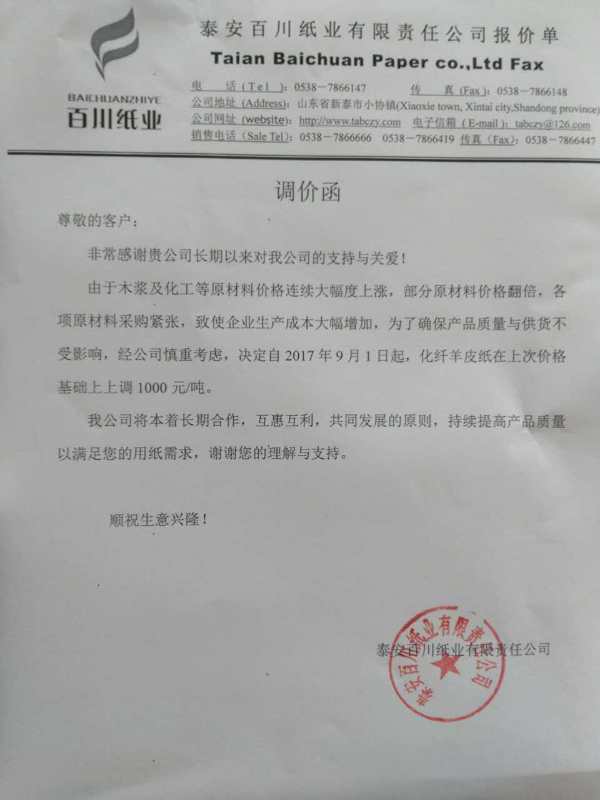8、 自9月1日起,泰安百川紙業(yè)化纖羊皮紙在原價格基礎上上調1000元/噸。