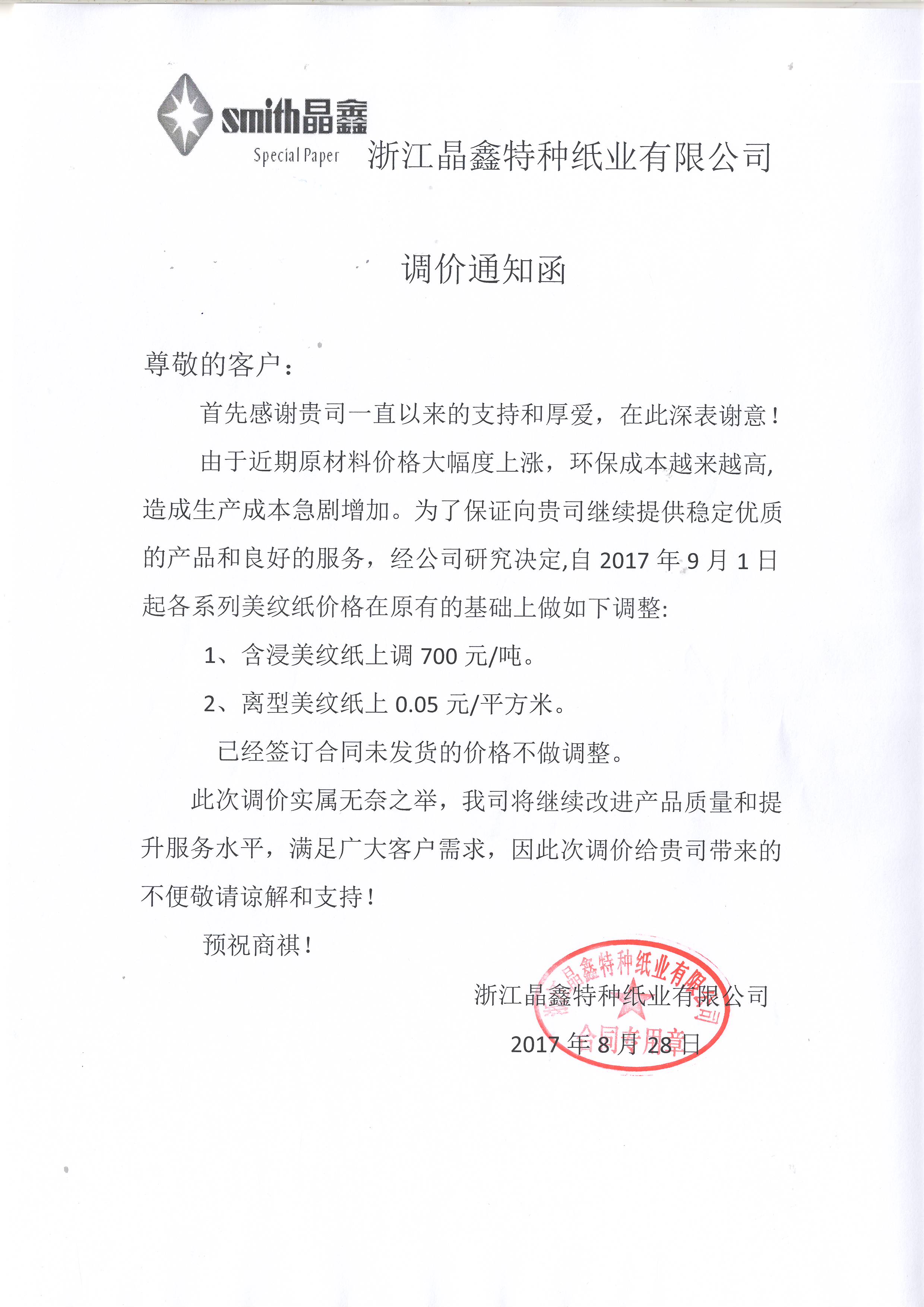 9、 自9月1日起,浙江晶鑫特種紙含浸美紋紙上調700元/噸,離型美紋紙上調0.05元/平方米。