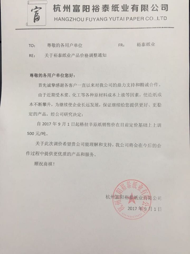 10、 自9月1日起,富陽裕泰紙業(yè)格拉辛紙在原價格基礎上上調500元每噸。