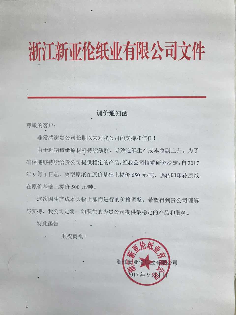 11、自9月1日起,浙江新亞倫紙業(yè)離型原紙、熱轉印印花原紙分別在原價基礎上提價650元/噸、500元/噸。
