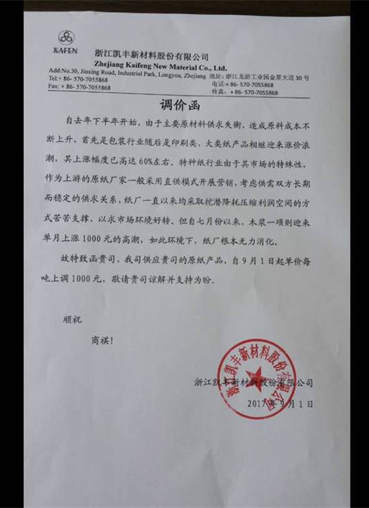 這僅僅是小編獲悉的一部分調價通知,還有一部分特種紙企業(yè)已通過其他形式向客戶通知了漲價的消息。
