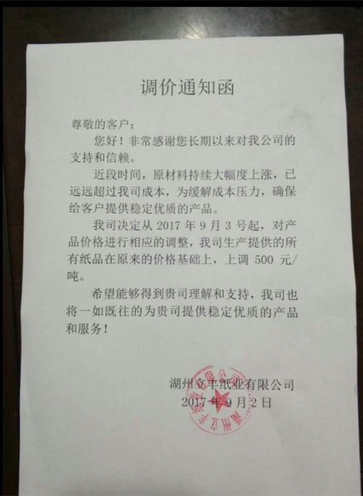 13、自9月3日起,湖州立豐紙業(yè)所有紙品在原價格基礎上,上調500元/噸。