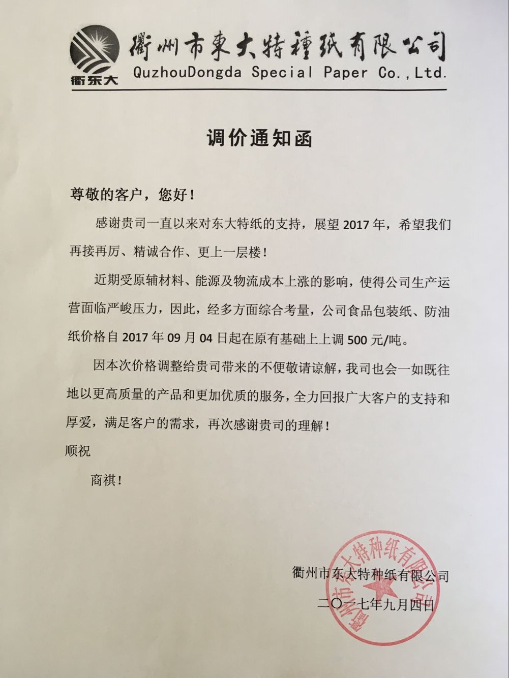 14、自9月4日起,衢州東大特種紙食品包裝紙、防油紙價格在原有基礎上上調500元/噸。