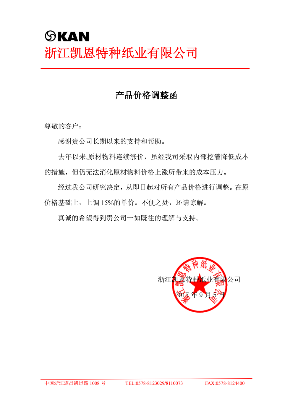 15、自9月5日起,凱恩特材所有產品價格在原價格基礎上上調 15%。