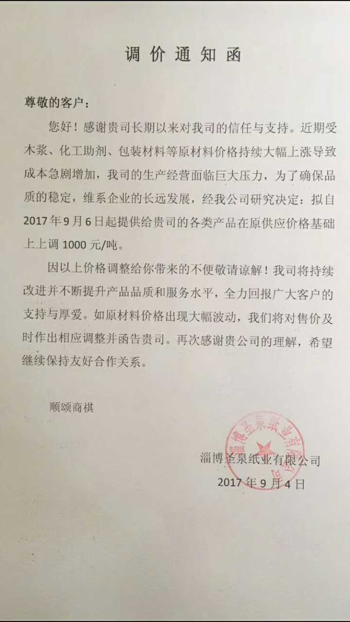17、自9月6日起,淄博圣泉紙業(yè)各類產品價格上調1000元/噸。