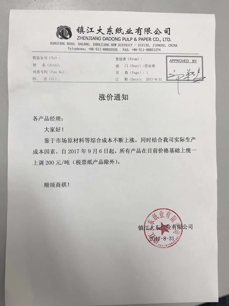 19、自9月6日起,鎮(zhèn)江大東紙業(yè)所有產品在目前價格基礎上上調200元/噸。