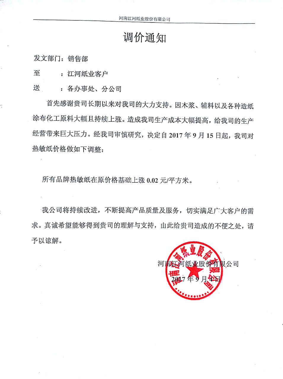 21、自9月15日起,江河紙業(yè)所有品牌熱敏原紙在原價格基礎上上漲0.02元/平方米。