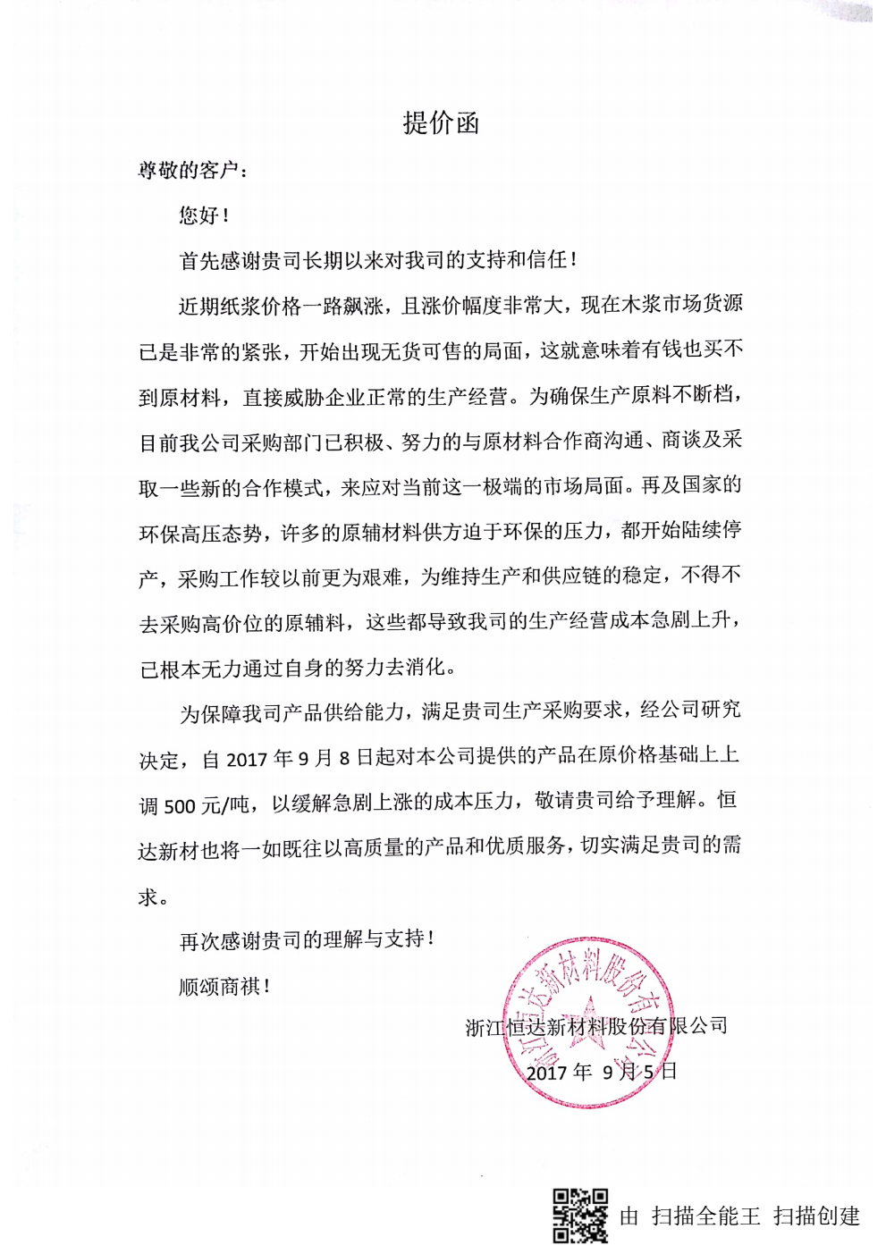 20、自9月8日起,恒達新材所有產品在原價格基礎上上調500元/噸。