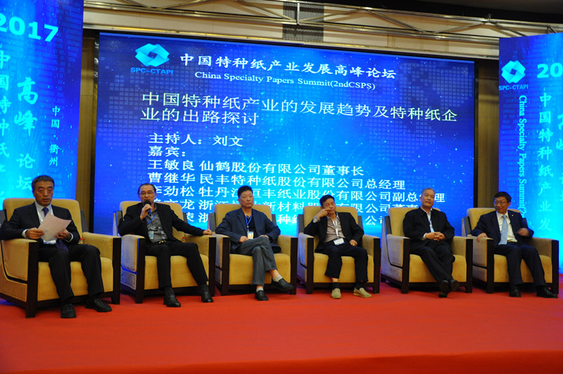 10月17日下午,2017特種紙產(chǎn)業(yè)發(fā)展高峰論壇隆重舉行,高峰論壇的最后一個環(huán)節(jié)是企業(yè)家圓桌論壇。主題是“中國特種紙產(chǎn)業(yè)的發(fā)展趨勢及特種紙企業(yè)的出路探討”,主持人為特紙委秘書長劉文,邀請的嘉賓有仙鶴股份有限公司董事長王敏良、民豐特種紙股份有限公司總經(jīng)理曹繼華、牡丹江恒豐紙業(yè)股份有限公司副總經(jīng)理李勁松、浙江恒達新材料股份有限公司董事長姜文龍、浙江金昌特種紙股份有限公司董事長張求榮。
