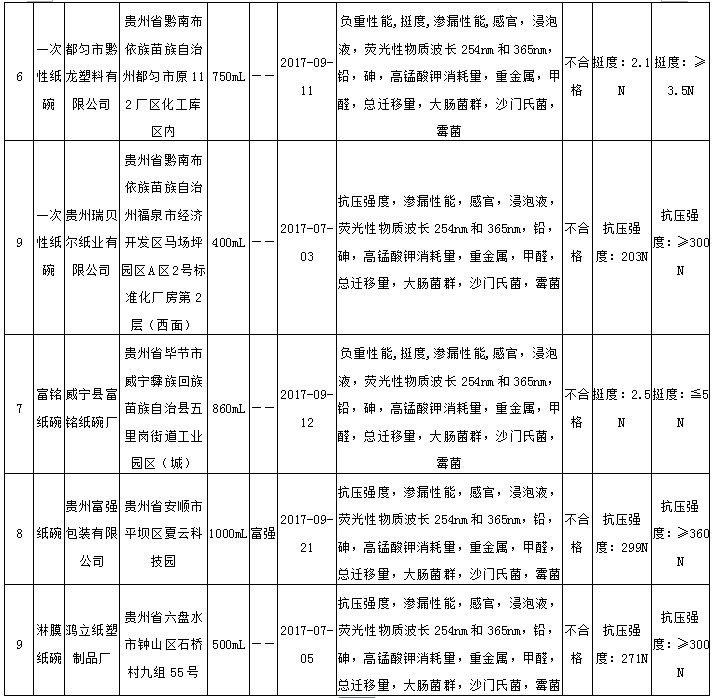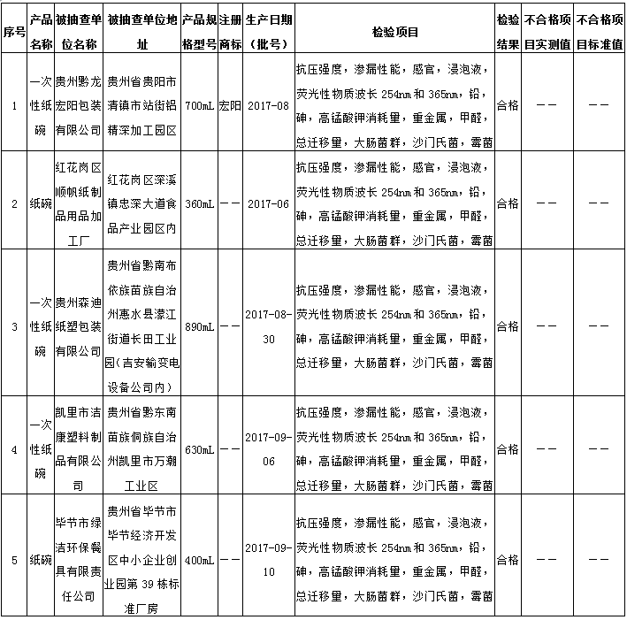 貴州省質(zhì)監(jiān)局12月4日發(fā)布“2017年食品用紙包裝、容器第二次產(chǎn)品質(zhì)量監(jiān)督抽查結(jié)果公告”,公告稱,為加大貴州省工業(yè)產(chǎn)品質(zhì)量監(jiān)督,保障工農(nóng)業(yè)生產(chǎn)安全和廣大消費(fèi)者人身財(cái)產(chǎn)安全,近期貴州省質(zhì)監(jiān)局對省內(nèi)食品用紙包裝、容器生產(chǎn)企業(yè)產(chǎn)品質(zhì)量進(jìn)行了第二次監(jiān)督抽查。本次抽查涉及貴陽市、遵義市、六盤水市、安順市、畢節(jié)市、黔東南州、黔南州10家企業(yè)生產(chǎn)的食品用紙包裝、容器產(chǎn)品10個批次。5家企業(yè)生產(chǎn)的5個批次產(chǎn)品檢驗(yàn)不合格。