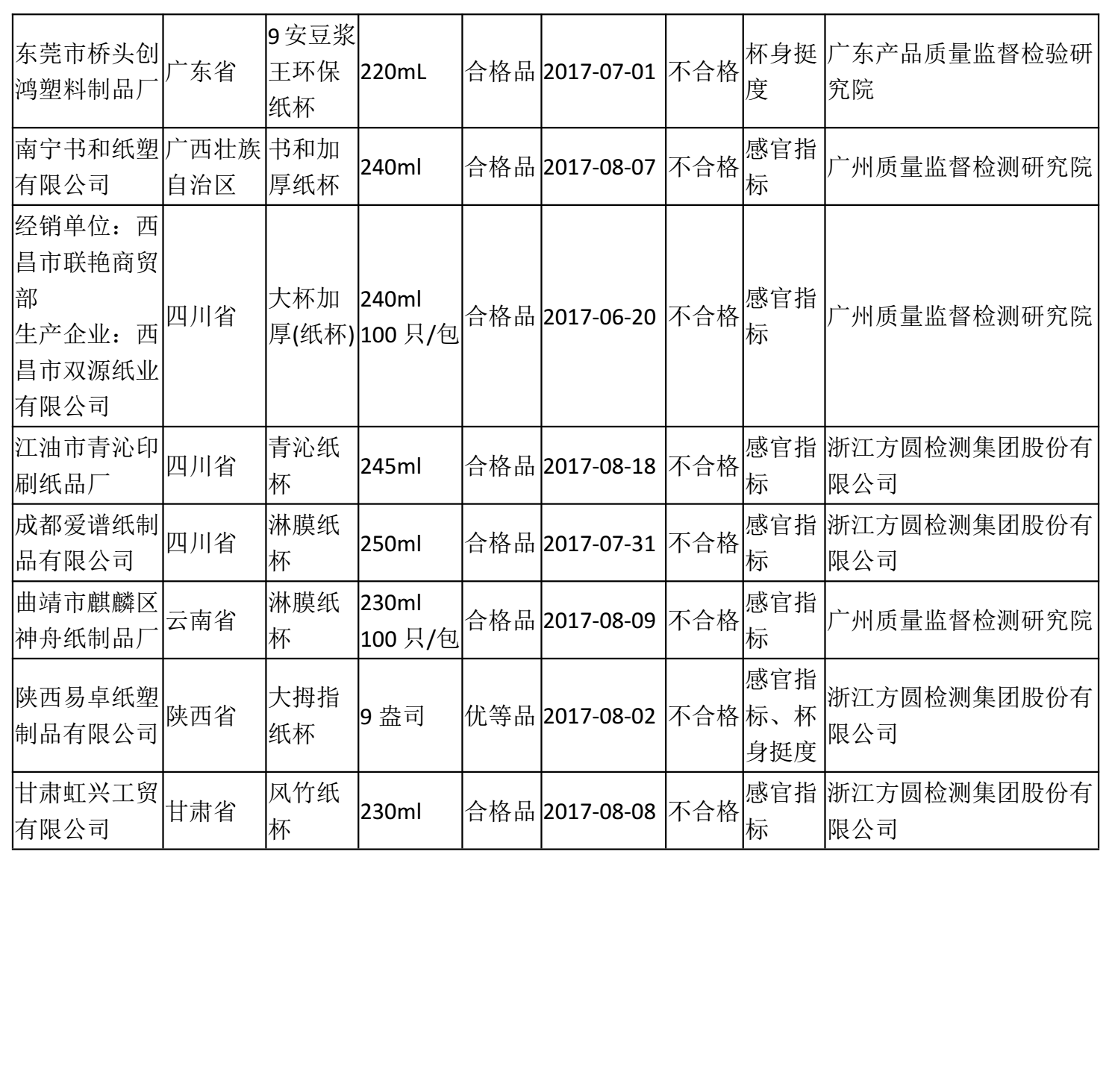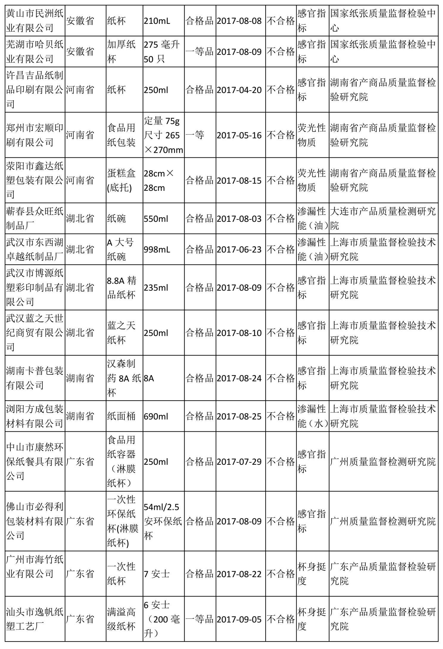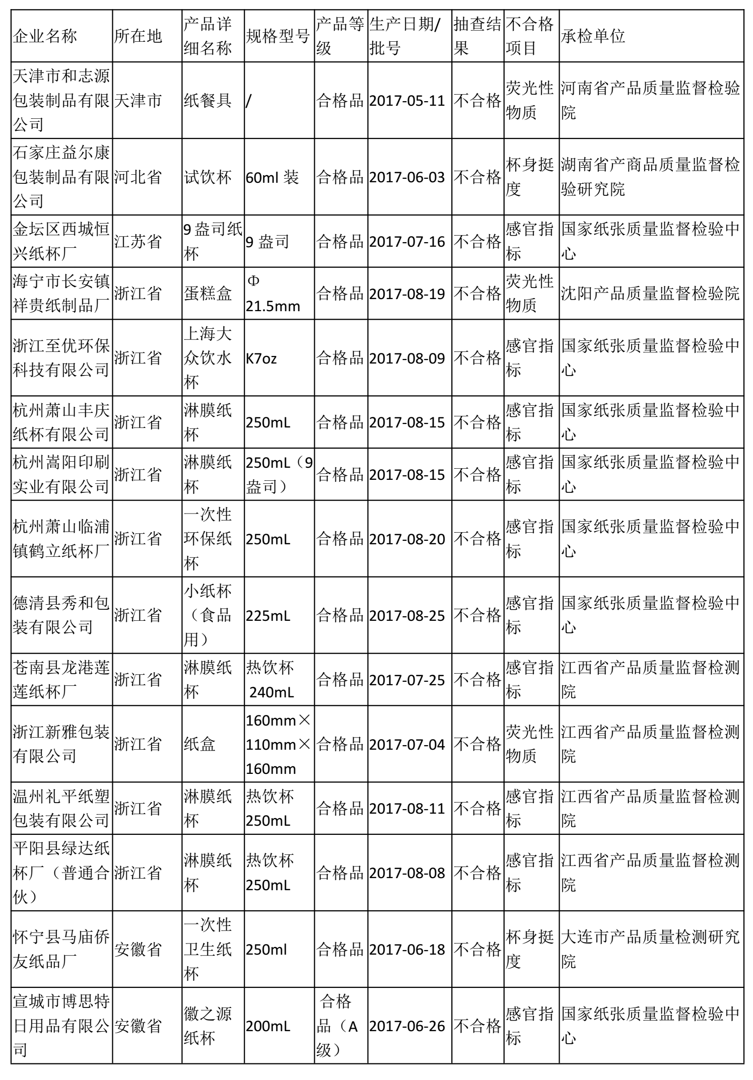 其中,本次抽查范圍包括食品包裝紙、食品包裝紙板、紙袋、紙罐、紙杯、紙餐具、紙盒等12種,共抽查了24個省、自治區(qū)、直轄市880家企業(yè)的926批次食品接觸用紙和紙板材料及制品產(chǎn)品。經(jīng)檢驗,有842家企業(yè)的888批次產(chǎn)品合格,38家企業(yè)的38批次產(chǎn)品不合格,不合格產(chǎn)品檢出率為4.1%。共發(fā)現(xiàn)不合格項39項次,包括熒光性物質(zhì)5項、感官指標25項、杯身挺度6項、滲漏性能(水)1項、滲漏性能(油)2項。本次在生產(chǎn)領域抽查了872家企業(yè)的872批次產(chǎn)品,其中37家企業(yè)的37批次產(chǎn)品不合格,不合格產(chǎn)品檢出率為4.2%;流通領域抽查了54家企業(yè)的54批次產(chǎn)品,其中1家企業(yè)的1批次產(chǎn)品不合格,不合格產(chǎn)品檢出率為1.9%(有在生產(chǎn)領域和流通領域同時被抽查到的企業(yè))。本次抽查大、中、小型企業(yè)比例為1:5:29,不合格產(chǎn)品檢出率分別為0.0%、0.7%、4.9%。