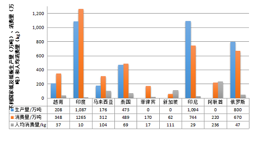 國家戰(zhàn)略“一帶一路”為中國企業(yè)“走出去”提供了機(jī)遇,也為中國制漿造紙工業(yè)的發(fā)展指明了新的方向,是解決產(chǎn)能過剩、外匯資產(chǎn)過剩的有效途徑?!耙粠б宦贰毖鼐€國家共有64個,主要包括東南亞11國、南亞7國、中亞6國、西亞18國、中東歐16國及獨(dú)聯(lián)體4國。一帶一路沿線國家人口總量巨大,占全球人口總數(shù)將近一半,而人均消費(fèi)量僅為全球紙及紙板人均消費(fèi)量平均值的40%,是中國紙及紙板人均消費(fèi)量的30%,消費(fèi)量及生產(chǎn)量的年均增長率均在3%左右,消費(fèi)量大大高于生產(chǎn)量,具有很大的發(fā)展空間?!耙粠б宦贰毖鼐€紙機(jī)紙板消費(fèi)量較大的國家有印度、印度尼西亞、俄羅斯、泰國、阿聯(lián)酋、越南、馬來西亞、菲律賓和新加坡,其紙及紙板生產(chǎn)量、消費(fèi)量和人均消費(fèi)量如圖所示。