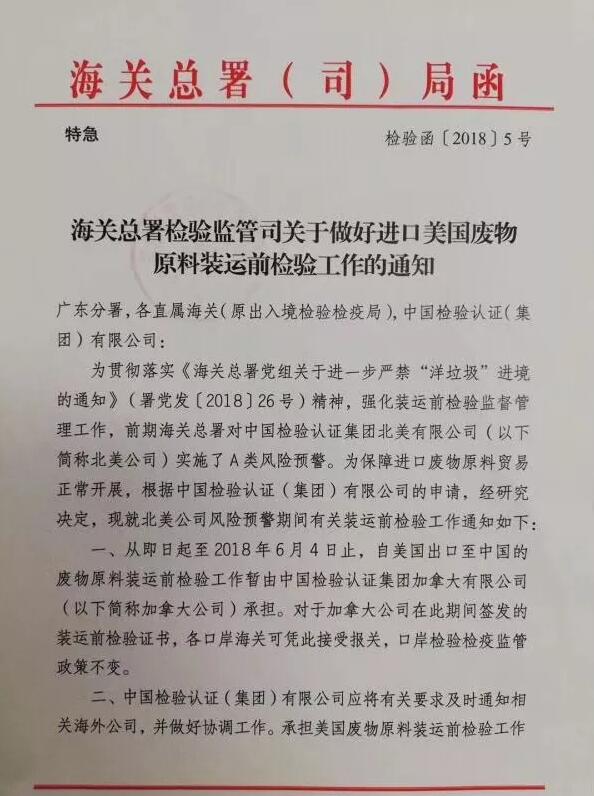 在此之前,5月2日海關(guān)總署發(fā)布的《海關(guān)總署關(guān)于對美國廢物原料實施風險預(yù)警監(jiān)管措施的通知》中指出:一、自2018年5月4日起,對來自美國的廢物原料實施100%開箱、100%掏箱檢驗檢疫;二、對中國檢驗認證集團北美有限公司實施A類風險預(yù)警措施,時間是一個月(2018年5月4日至6月4日)。期間,該公司不再承擔進口廢物原料裝運前檢驗工作,暫停其使用中國進口廢物原料裝運前檢驗信息管理系統(tǒng)(PSI)。