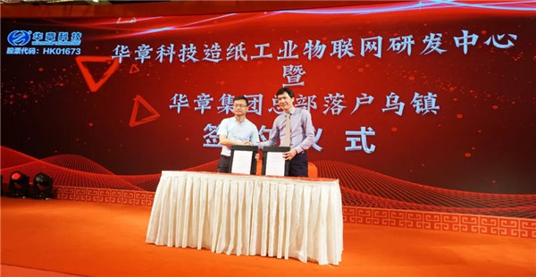 在慶典的最后,舉行了華章科技造紙工業(yè)物聯(lián)網(wǎng)研發(fā)中心暨華章集團(tuán)總部落戶烏鎮(zhèn)的簽約儀式,烏鎮(zhèn)黨委副書記、鎮(zhèn)長張標(biāo)和華章科技控股有限公司CEO王愛燕代表雙方簽約。