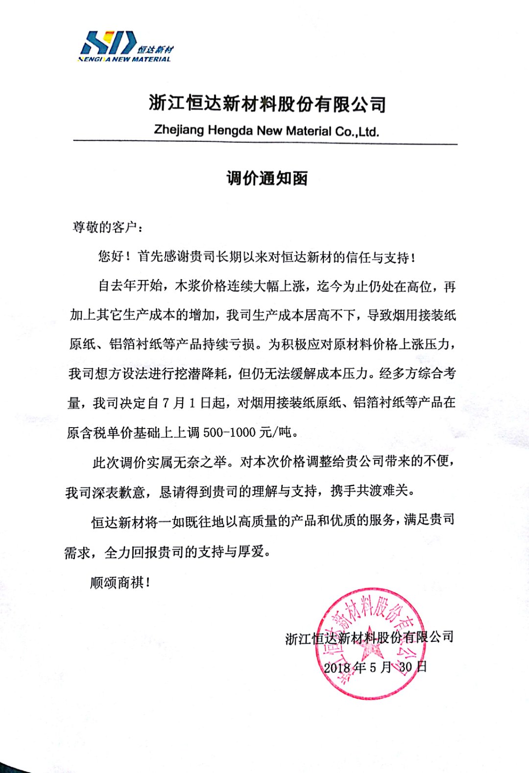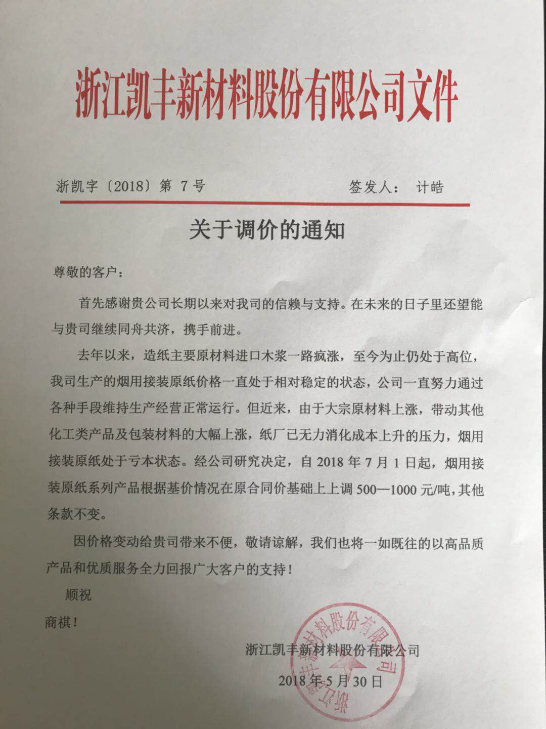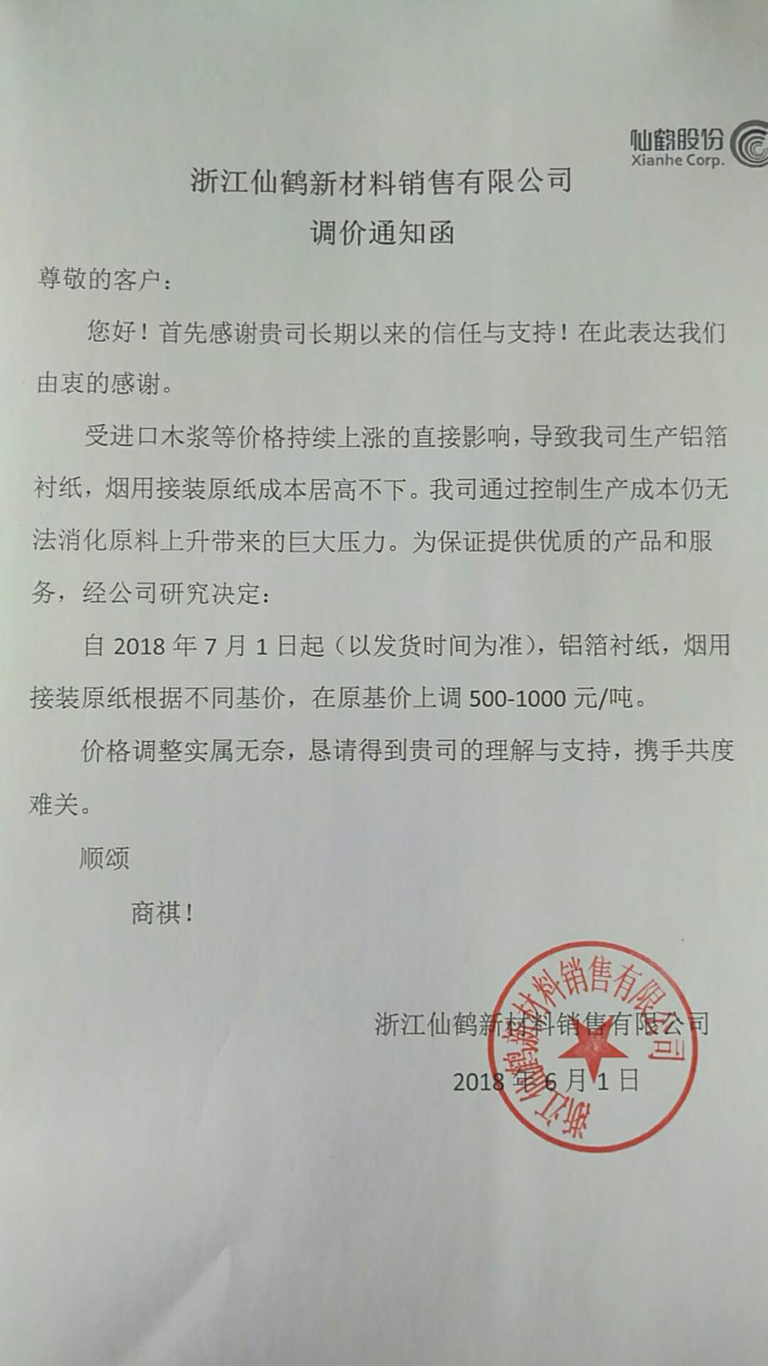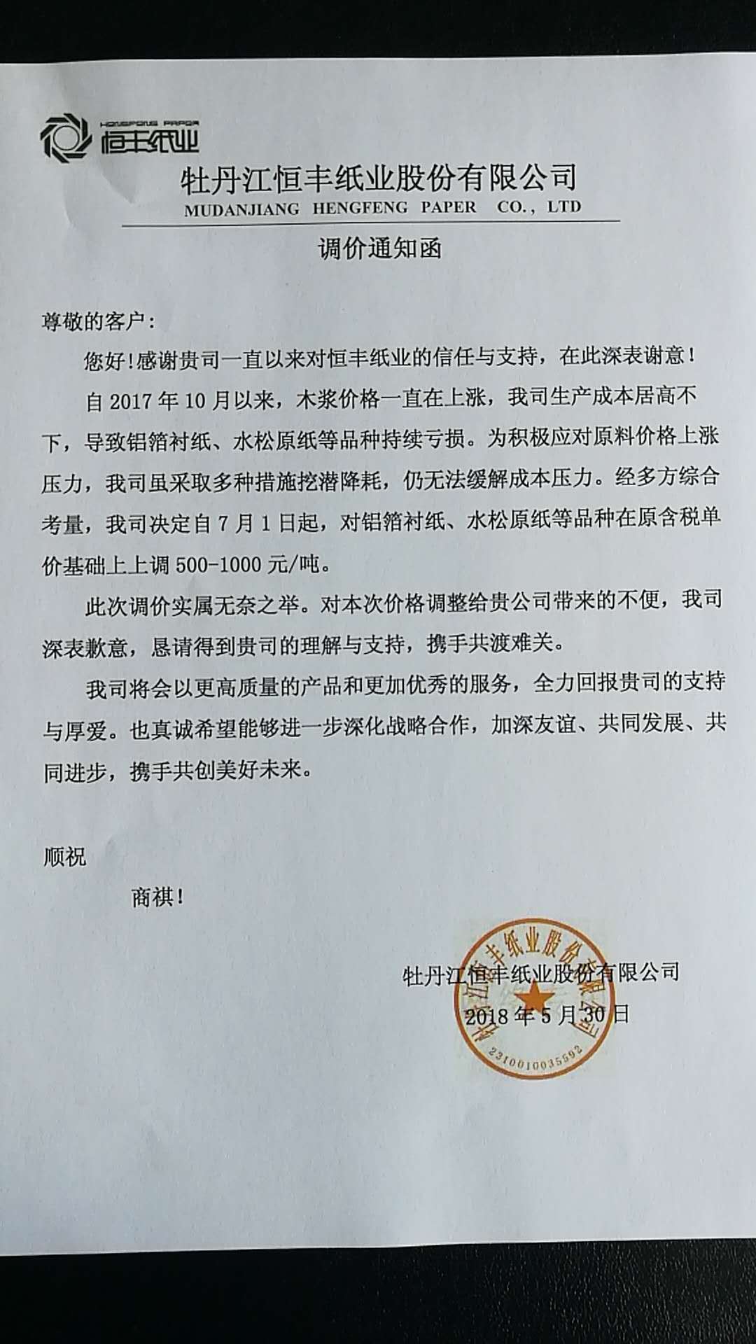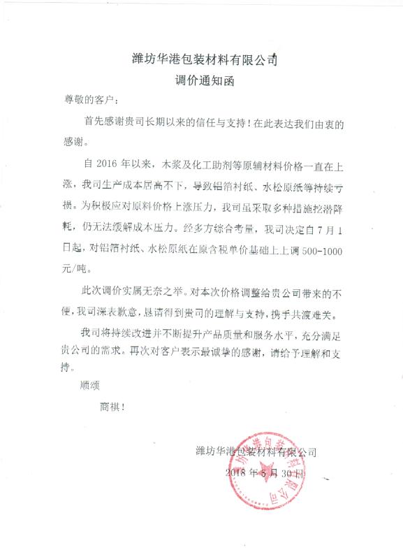 近日,多家特種紙企業(yè)受木漿等原材料價(jià)格持續(xù)上漲的影響,成本居高不下,公布了調(diào)價(jià)通知函。