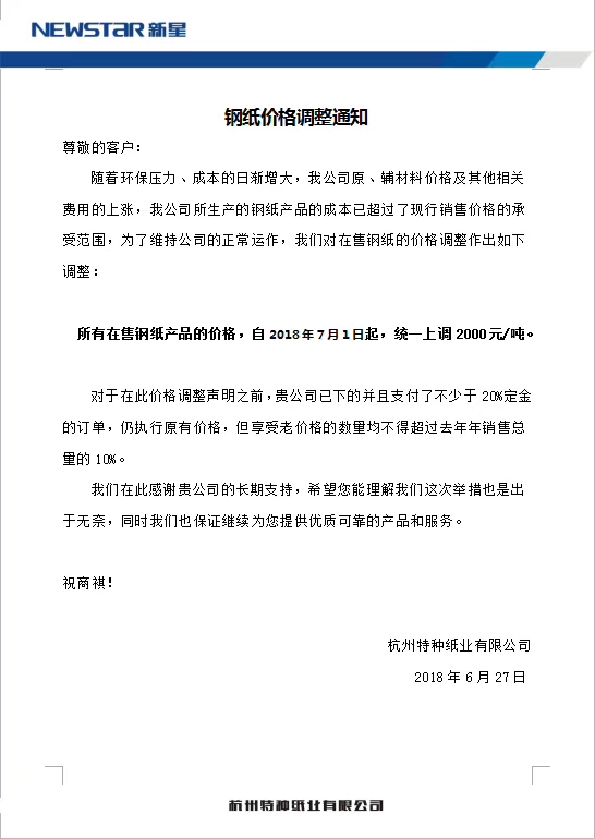 杭州特種紙業(yè)有限公司:對(duì)于所有在售鋼紙產(chǎn)品價(jià)格,自2018年7月1日起,統(tǒng)一上調(diào)2000元/噸。對(duì)于聲明之前,貴公司支付了不少于20%定金的訂單,仍執(zhí)行原有價(jià)格,但享受老價(jià)格的數(shù)量不得超過(guò)去年銷售總量的10%。