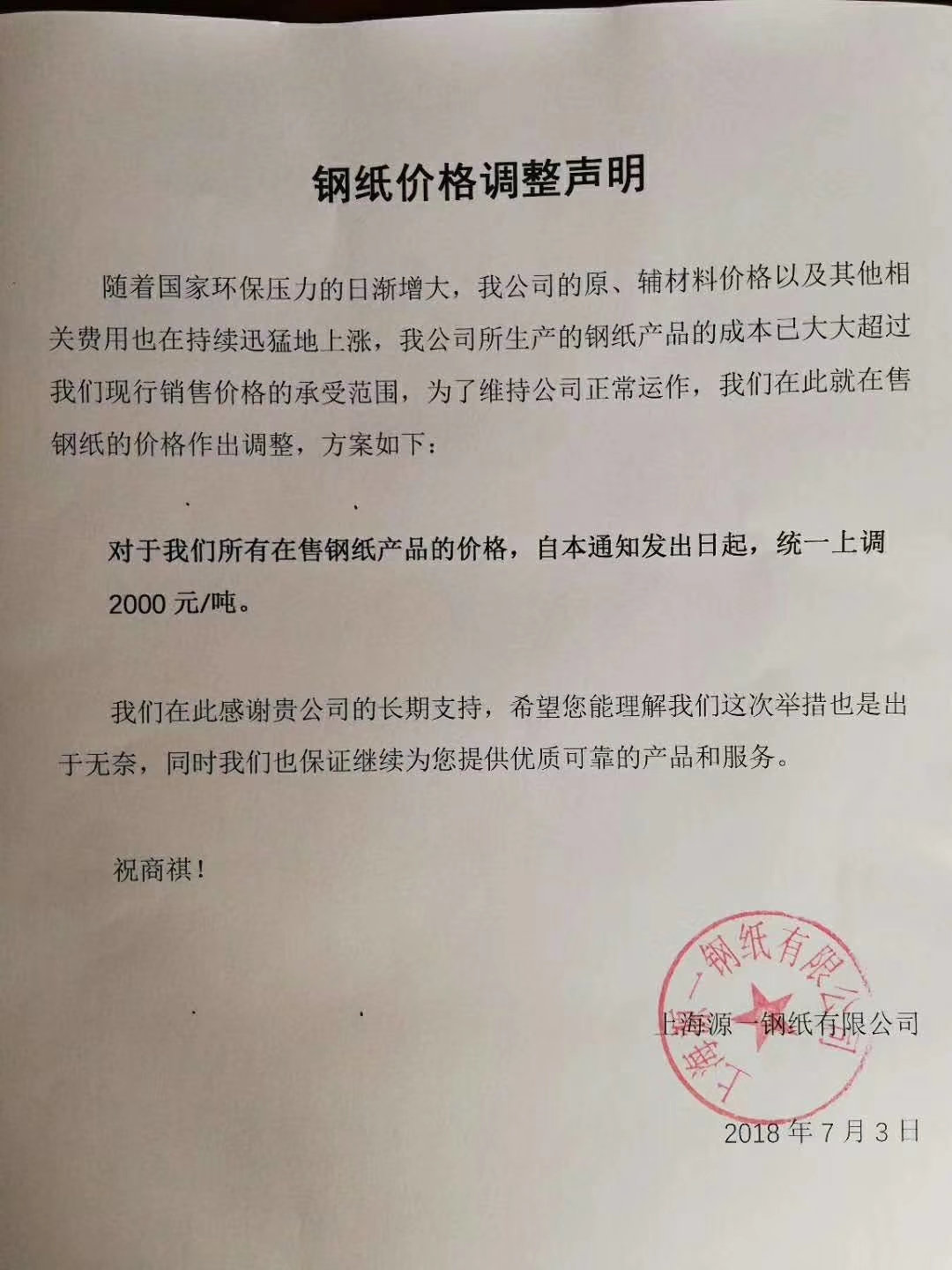 近日,有生產(chǎn)鋼紙的企業(yè)因環(huán)保壓力增大,原、輔料及其他成本持續(xù)迅猛增長(zhǎng),發(fā)布調(diào)價(jià)函。