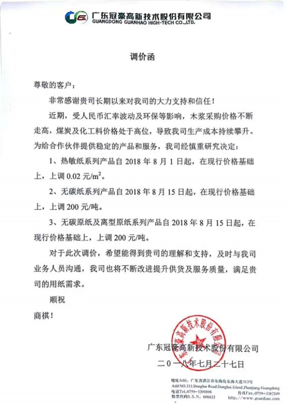 1、 熱敏紙系列產(chǎn)品自2018年8月1日起,在現(xiàn)行價(jià)格基礎(chǔ)上,上調(diào)0.02元/m2。