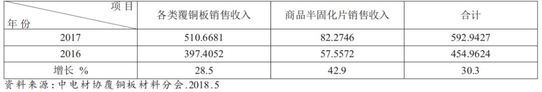 全國商品半固化片產(chǎn)銷量、銷售收入同比都有較大幅增長(見表2)。2017年全國覆銅板和商品半固化片的合計銷售收入同比得到30.3%的巨大增長(見表3)。