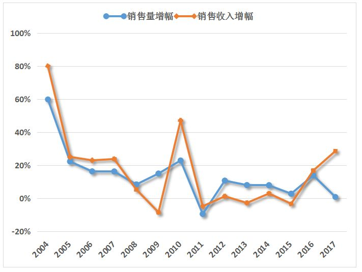 圖1 2004-2017年我國覆銅板(不含半固化片)銷售變化趨勢
