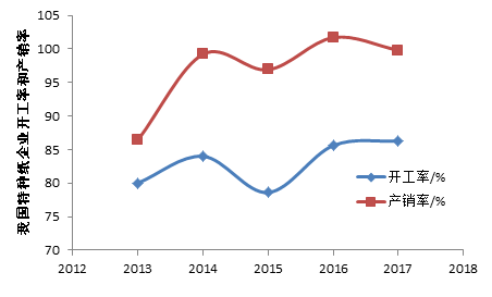 2013-2017年我國部分特種紙企業(yè)的開工率和產(chǎn)銷率