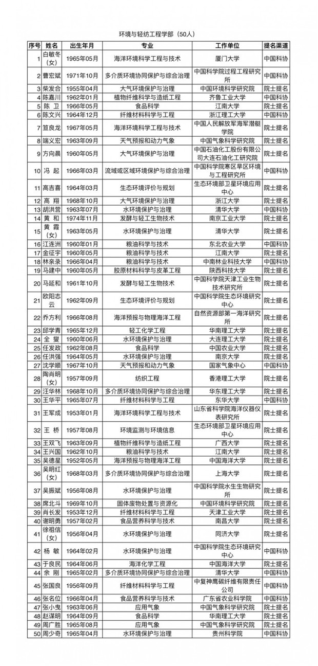 環(huán)境與輕紡工程學(xué)部共有候選人50名,名單中包括了齊魯工業(yè)大學(xué)陳嘉川教授,華南理工大學(xué)邱學(xué)青教授和廣西大學(xué)王雙飛教授三位從事制漿造紙專(zhuān)業(yè)研究的專(zhuān)家。