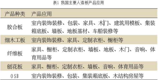 我國人造板主要用于建筑裝飾裝修、家具、地板、門窗、以及包裝材料等領(lǐng)域,詳見表1。其中,我國人造板在家具生產(chǎn)和室內(nèi)裝飾裝修中的用量占比最大,其余主要用于建筑、包裝和集裝箱底板等。在室內(nèi)裝修、家具制作領(lǐng)域使用的人造板多為二次加工飾面后的人造板,其中膠合板和細(xì)木工板飾面方式主要是油漆和表面貼覆裝飾紙,纖維板飾面方式主要是油漆、表面貼覆裝飾紙和PVC,刨花板飾面方式主要是表面貼覆裝飾紙,而定向刨花板(OSB)主要是直接油漆飾面或表面貼單板后再油漆飾面。