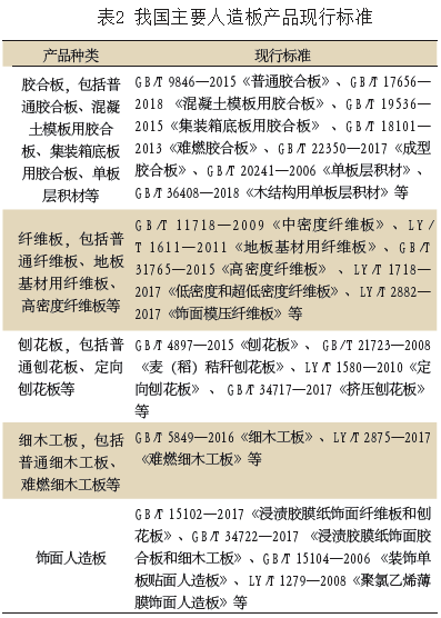 目前,我國人造板行業(yè)已基本形成了以國家標(biāo)準(zhǔn)為主體,以行業(yè)標(biāo)準(zhǔn)、地方標(biāo)準(zhǔn)、團(tuán)體標(biāo)準(zhǔn)和企業(yè)標(biāo)準(zhǔn)補(bǔ)充配套的標(biāo)準(zhǔn)體系,并在相關(guān)領(lǐng)域形成了一批重要標(biāo)準(zhǔn),為人造板行業(yè)發(fā)展提供了有力的技術(shù)支撐,表2為我國目前現(xiàn)行的主要人造板產(chǎn)品標(biāo)準(zhǔn)。