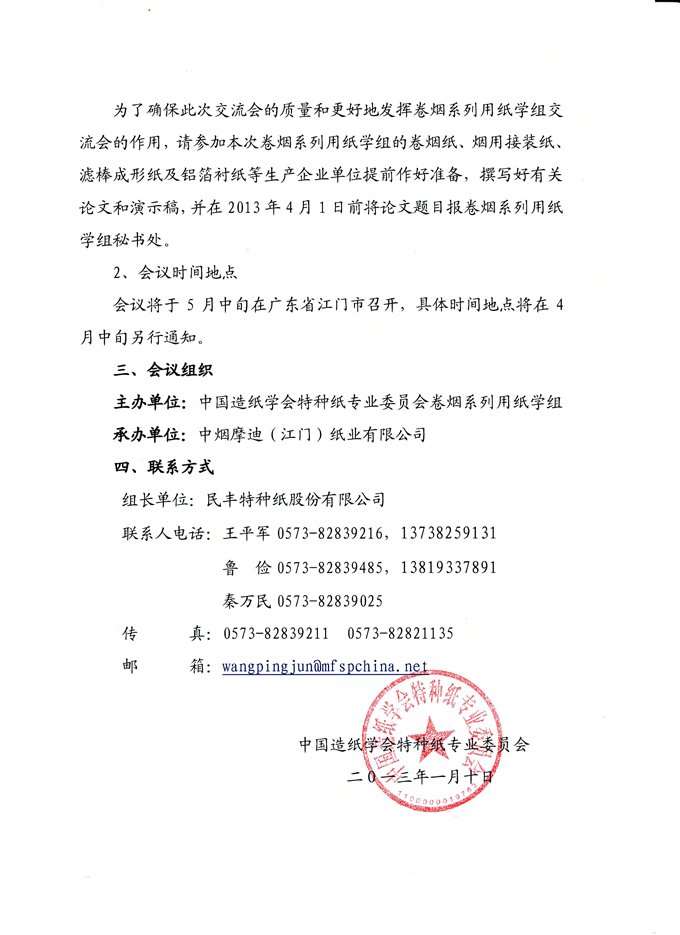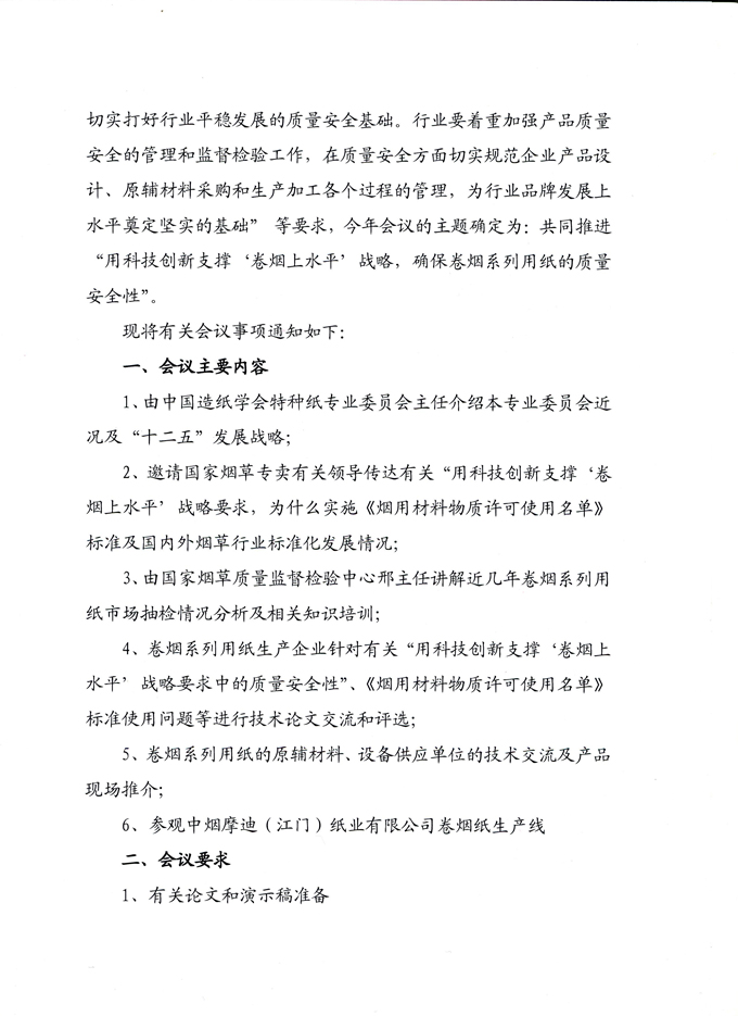 關(guān)于召開特種紙委員會卷煙系列用紙學(xué)組第二屆技術(shù)交流會的通知