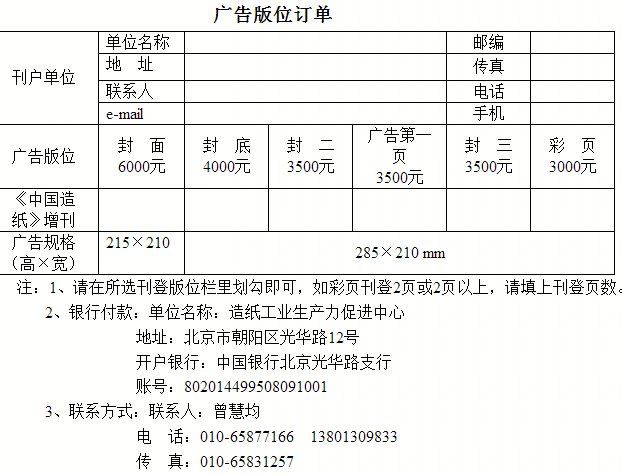 特種紙委員會(huì)成立至今已經(jīng)成功舉辦了四屆年會(huì),得到了廣大特種紙行業(yè)的專家、學(xué)者、企業(yè)界人士的大力支持,也受到了參會(huì)的造紙、設(shè)備、化學(xué)品等企業(yè)好評(píng),為特種紙行業(yè)開展技術(shù)交流和企業(yè)宣傳及技術(shù)合作,提供了良好的平臺(tái)。 為了樹立會(huì)員單位的形象,擴(kuò)大會(huì)員單位的影響,宣傳會(huì)員單位的產(chǎn)品,提高特紙委的服務(wù)水平,特紙委計(jì)劃對(duì)往屆年會(huì)上征集的優(yōu)秀論文進(jìn)行整理并編輯出版《中國造紙》2010年增刊-《特種紙?jiān)旒埣夹g(shù)專輯》,為籌集出版發(fā)行費(fèi)用,現(xiàn)開始征集增刊廣告。 非常感謝各會(huì)員單位的大力支持,希望刊登廣告的單位盡快與特紙委聯(lián)系,或直接將廣告內(nèi)容的電子版發(fā)至特紙委郵箱,并將廣告費(fèi)匯至特紙委賬戶,以爭取在第五屆年會(huì)召開前出版增刊。 特種紙委員會(huì) 2010-4-21 請(qǐng)刊登廣告的單位將下面訂單回執(zhí)于5月31日前回傳至特紙委,謝謝!