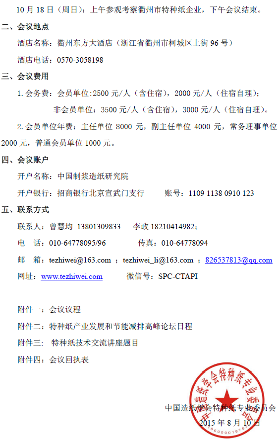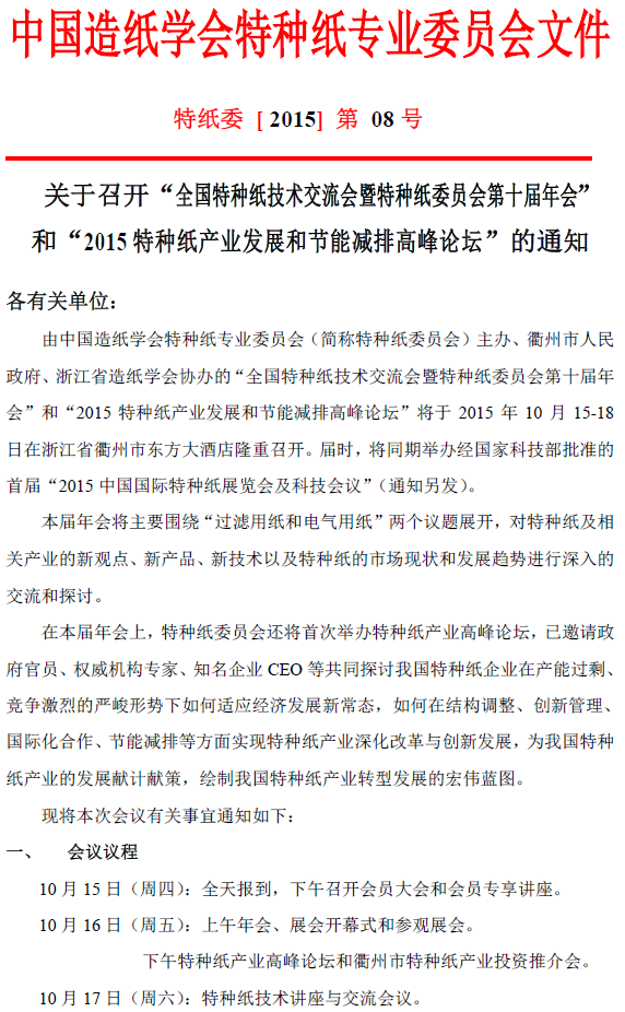 關(guān)于召開“全國特種紙技術(shù)交流會(huì)暨特種紙委員會(huì)第十屆年會(huì)”和“特種紙產(chǎn)業(yè)發(fā)展和節(jié)能減排高峰論壇”的通知
