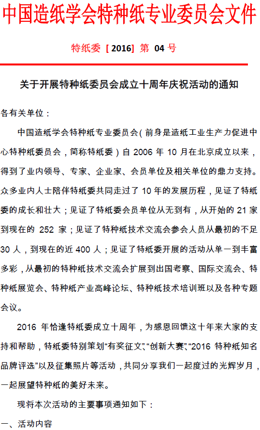 關(guān)于開展特種紙委員會成立十周年慶?;顒拥耐ㄖ娮影?/span>