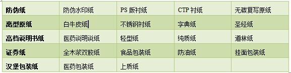 公司的主要產(chǎn)品有:字典紙、圣經(jīng)紙、PS板包裝紙、水松原紙、鋁箔襯紙、漢堡包裝紙、離型原紙、食品包裝紙、防油紙等各類17克-55克薄頁紙;輕質(zhì)紙、純質(zhì)紙、全木漿雙膠紙、道林紙、上質(zhì)紙等文化用紙;及防偽水印紙、安全線防偽紙、纖維防偽紙、證券紙、無碳復(fù)寫紙、高檔說明書用紙、醫(yī)藥包裝紙等各類特殊用紙共20多個品種50多個規(guī)格,年產(chǎn)機(jī)制紙能力5萬噸以上。